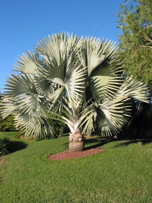 Destaca por el color gris azulado de sus hojas, que la convierten en una de las palmeras más vistosas.